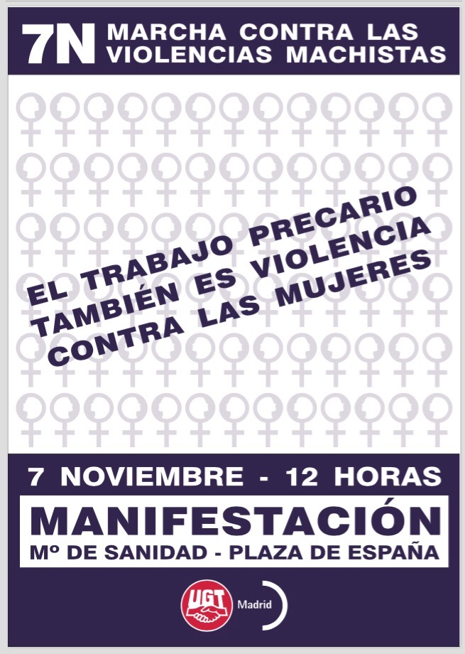 Por todo lo anterior, UGT Madrid moviliza a los trabajadores y trabajadoras de la Comunidad de Madrid en contra de la Violencia de Género y anuncia que participa en la convocatoria de la Manifestación que va a tener lugar el 7 de noviembre en Madrid desde el Ministerio de Sanidad hasta la Plaza de España.