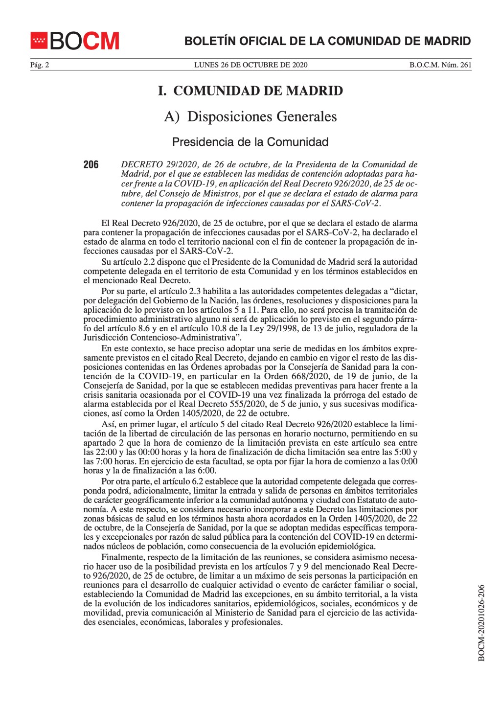 DECRETO 29/2020, de 26 de octubre, de la Presidenta de la Comunidad de Madrid, por el que se establecen las medidas de contención adoptadas para hacer frente a la COVID-19, en aplicación del Real Decreto 926/2020, de 25 de octubre, del Consejo de Ministros, por el que se declara el estado de alarma para contener la propagación de infecciones causadas por el SARS-CoV-2.