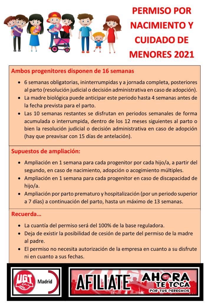 Os recordamos, tal y como estaba previsto desde la aprobación del Real Decreto-ley 6/2019, de 1 de marzo, de medidas urgentes para garantía de la igualdad de trato y de oportunidades entre mujeres y hombres en el empleo y la ocupación, que, a partir del 1 de enero de 2021, se equipará la duración del permiso por nacimiento y cuidado del menor para los dos progenitores, tanto en los casos de parto como adopción.