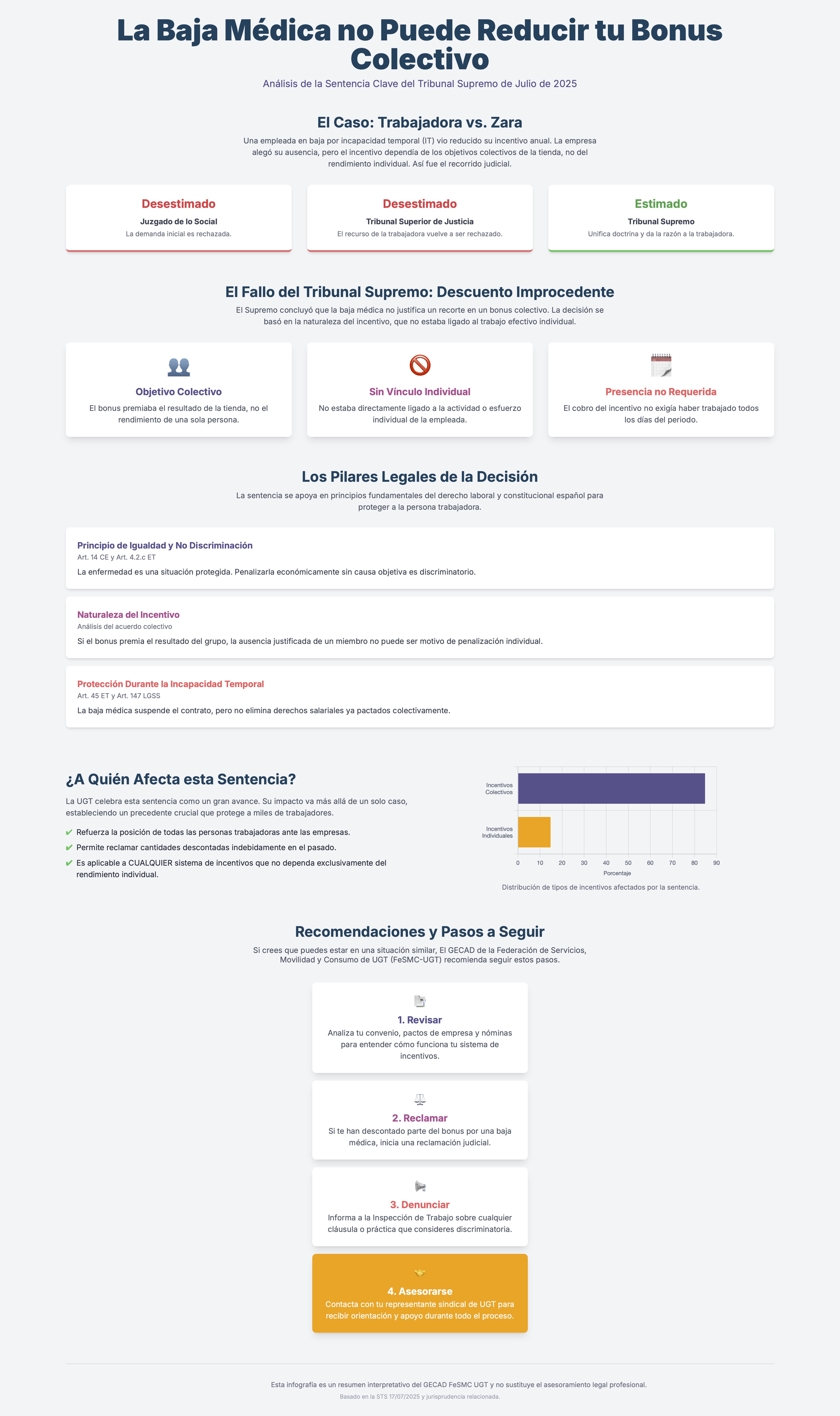 El fallo, dictado en unificación de doctrina, resuelve el caso de una trabajadora de Zara a la que se le dedujo parte del bonus correspondiente al año 2019 por haber estado en situación de incapacidad temporal durante varios días. El Tribunal considera que este descuento es discriminatorio e injustificado, dado que el incentivo estaba ligado a resultados colectivos (del grupo de tienda) y no exclusivamente al rendimiento individual.