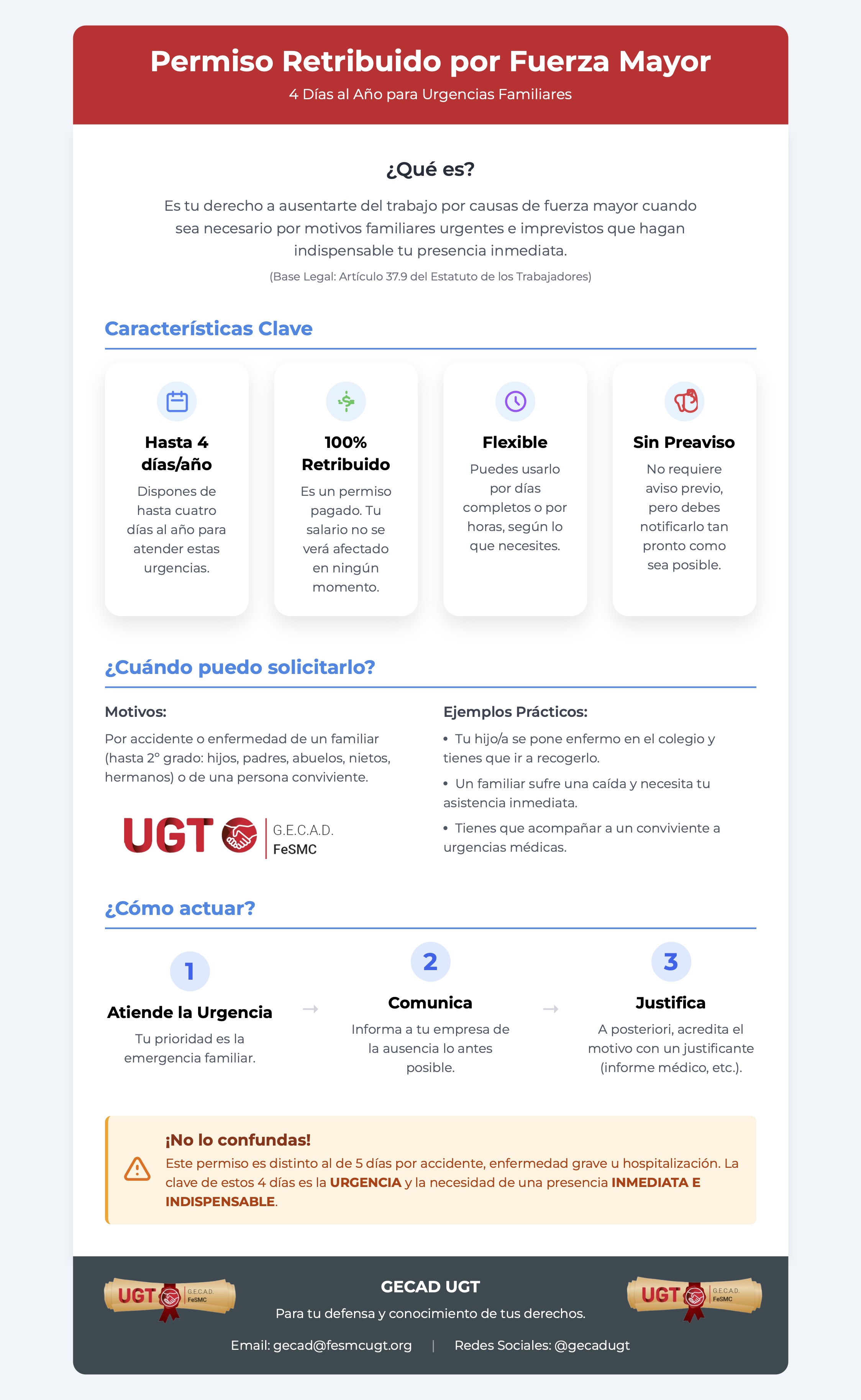 Desde GECAD UGT, recordamos que este permiso es distinto y compatible con otros, como el de cinco días por hospitalización, enfermedad o accidente grave. La diferencia principal radica en el factor sorpresa y la necesidad de una respuesta inmediata que caracteriza al permiso por fuerza mayor.