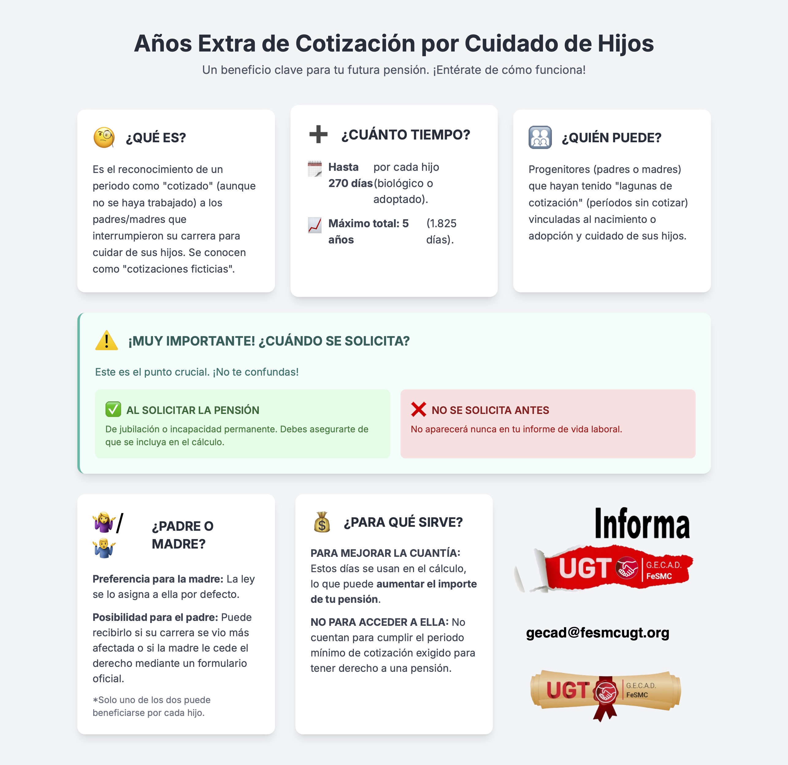Este beneficio, a menudo desconocido, reconoce como cotizados hasta 270 días por cada hijo (tanto biológico como adoptado). Este periodo se imputa a los progenitores que hayan visto afectada su vida laboral por dedicarse al cuidado de los menores, siempre que se hayan producido interrupciones en la cotización.